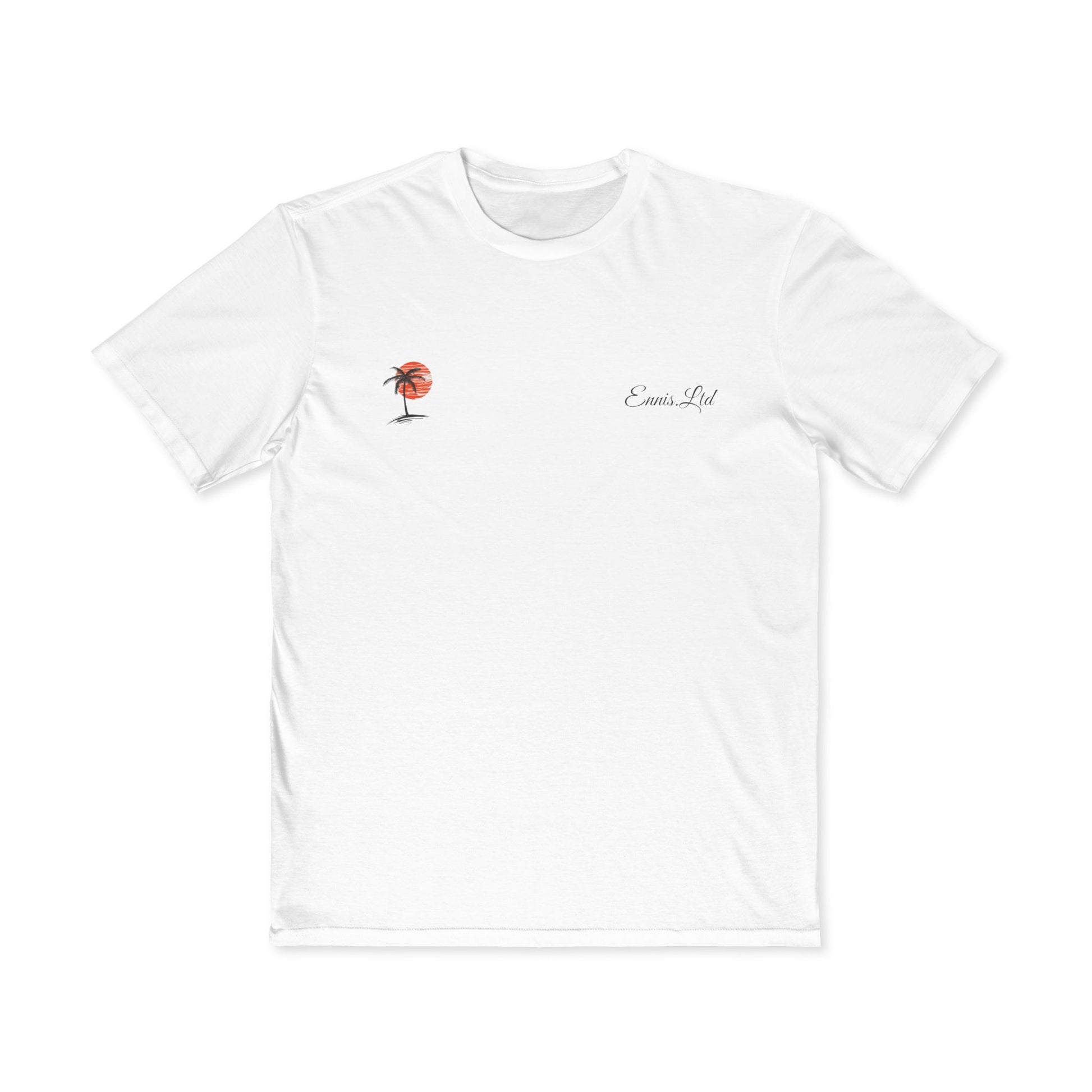 Light, breezy, and quietly confident—this tee brings a little sunset escape into everyday life. A small palm-and-sun emblem sits over the heart while a larger, painterly sunset scene and script on the back read like a passport stamp from a shoreline you keep returning to in your head. The semi-slim cut layers easily under a jacket or stands alone on warm days. Built from lightweight knit with a soft ribbed collar and taped shoulders, it stays comfortable after long wears and many washes. Wear it when you're chasing late afternoons, meeting friends for low-key drinks, or packing light for a weekend by the coast.